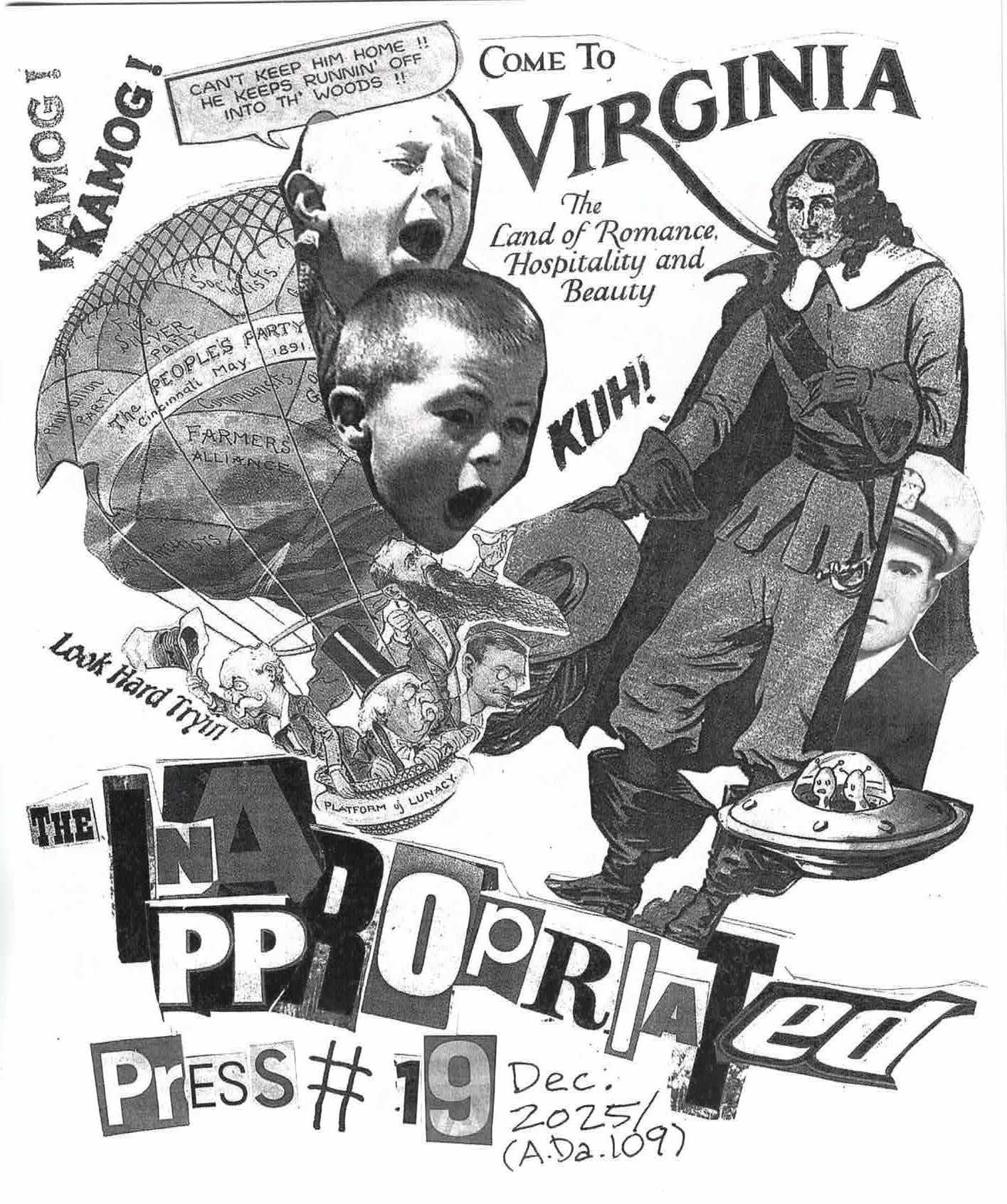 The in-Appropriated Press sinks its roots in the Appalachian Virginia counterculture of the Roanoke & New River Valleys’ avant-underground, while still featuring work from poets and artists across the country who have become extended family through their collaboration with the community over the years.